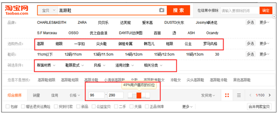 比如,在搜索关键词“高跟鞋”的时候,至于价格区间选项肯定代表不同的人群。但是你看“选购热点”还有“筛选条件”这里,你看,喜欢“御姐专属”和喜欢“公主范”这两个热点的人,可以明显的感受到,是两种完全不同的标签;然后在鞋跟款式那里,粗跟和细跟基本也代表了两个不同的人群。